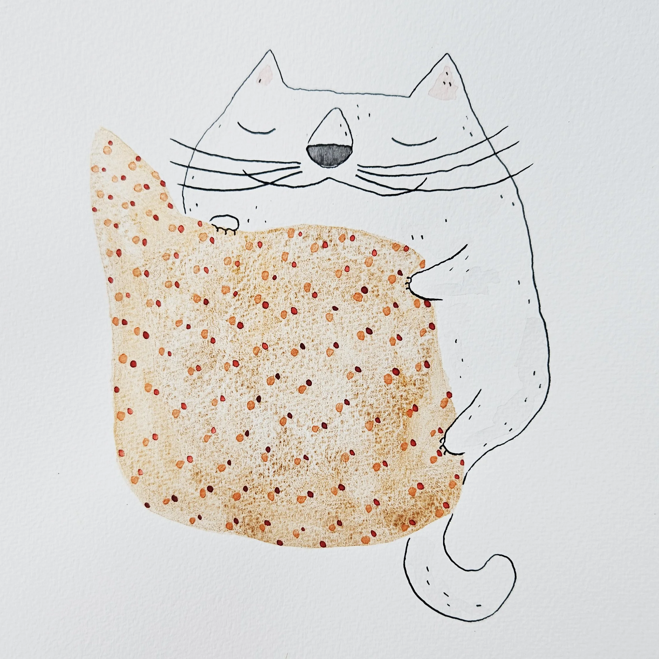 Dessin original d’un chat sous sa couette, sur papier aquarelle 300 gr, réalisé à l’aquarelle et à la plume. Certaines aquarelles sont pailletées.